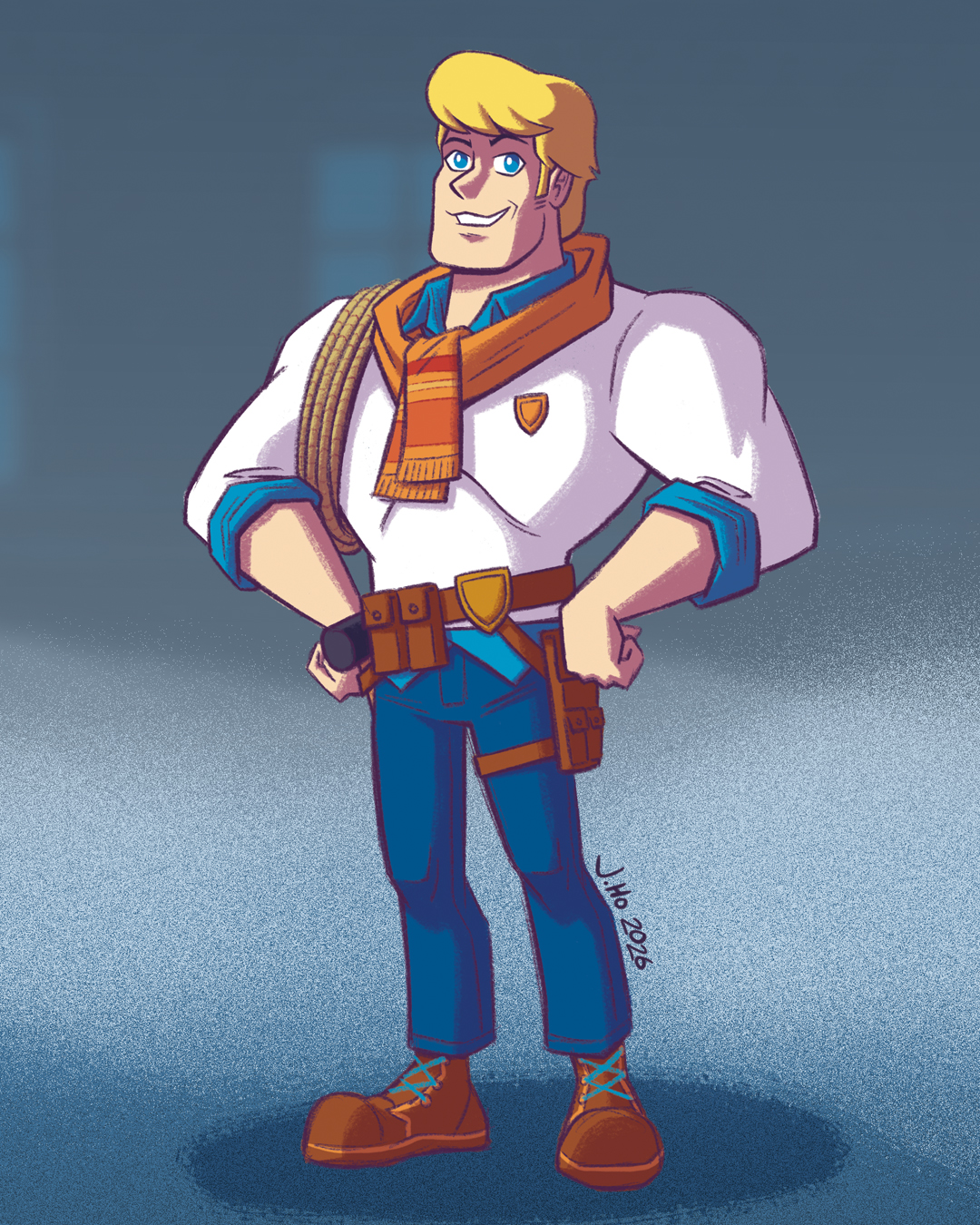- Fred Jones: The preppy rich kid (note: family crest monogramed on sweater plus matching belt buckle) who’s an outcast because of his obsession with mysteries and traps. I love a utility belt, so Fred’s trap fixation was a good excuse to draw him with some tools and gear.