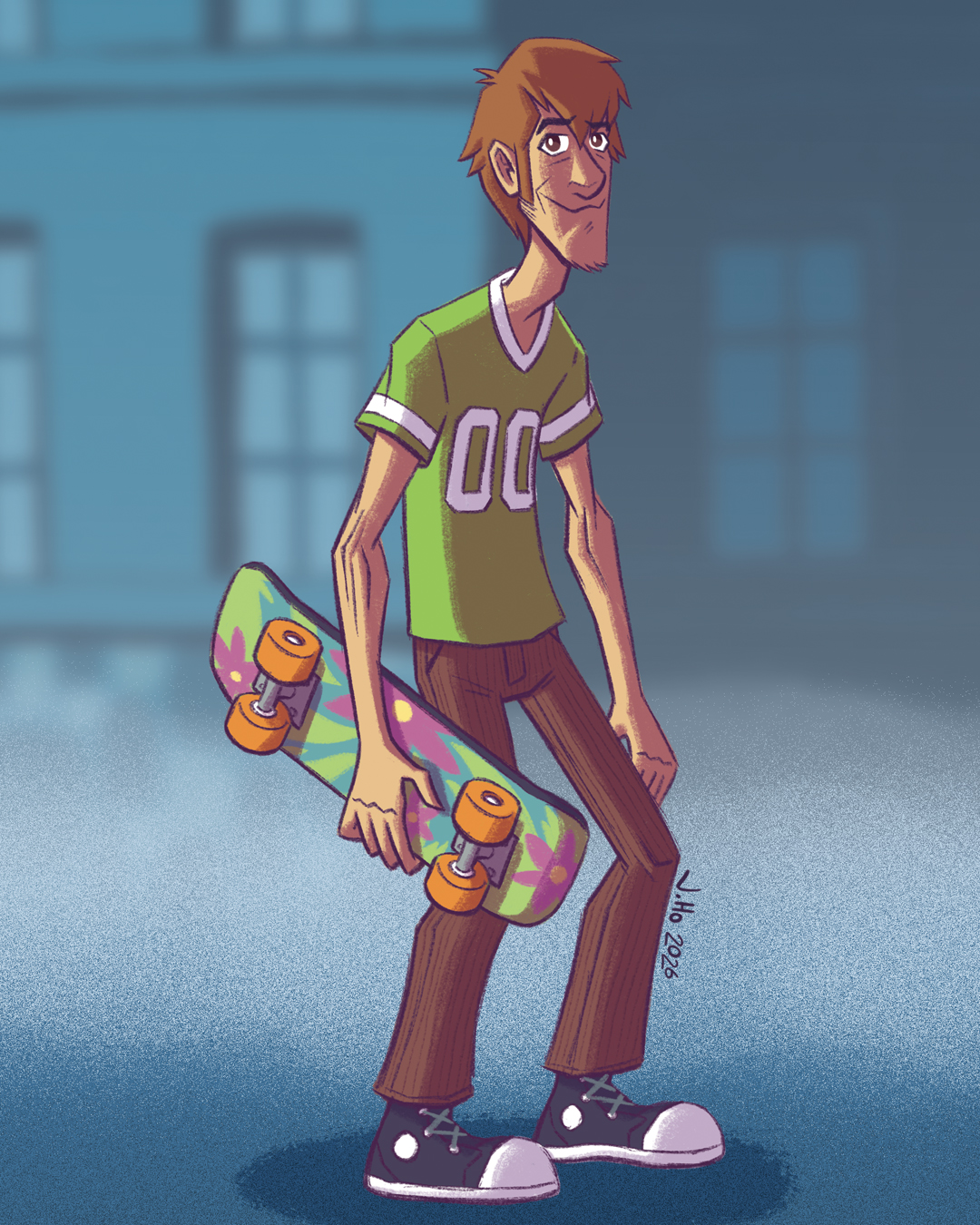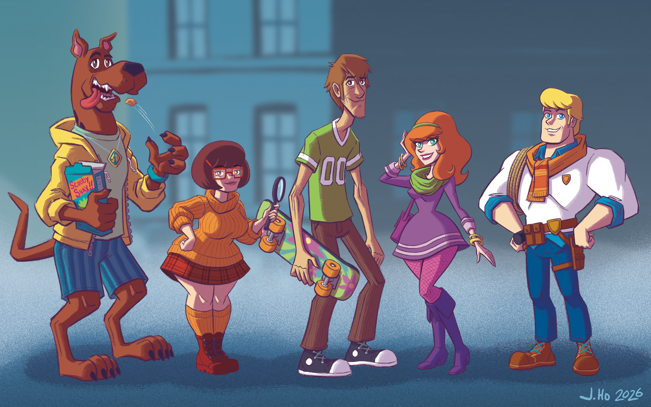- Scooby-Doo: Canonical Scooby spends so much time standing on his hind legs and behaving anthropomorphically, I thought it just made sense to depict him as fully bipedal for my head-canon redesign. And since each human character in the cast fills the role of a classic teen archetype, I decided to cast Scooby as a beach bum. The Scooby Gang’s base of operations varies from version to version, but I dig the idea of them being based out of California, so the role of beach bum felt even more appropriate for our main character.
